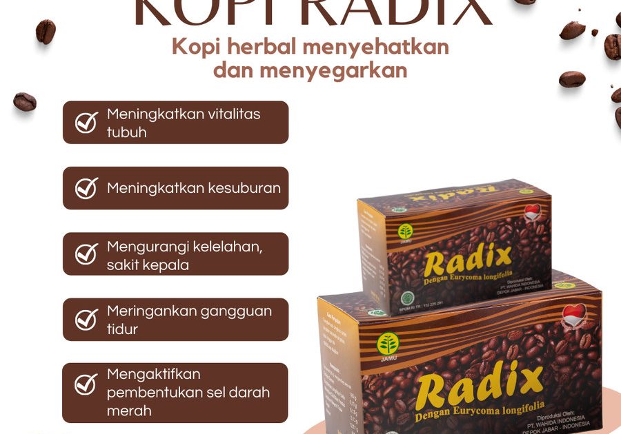 “Kopi Herbal Radix Untuk Menjaga Stamina Pria” ( Produk Unggulan Dari Herba Wahida ) Kopi herbal RADIX dibuat dari racikan ekstrak herbal maca, mengkudu dan berbagai macam herbal lain, dikombinasikan dengan kopi dan krimer nabati yang gurih serta gularafinasi terbaik. Kopi RADIX menggunakan teknologi “Double Extraction” dengan komposisi 80% kopi robusta dan 20% kopi arabika….